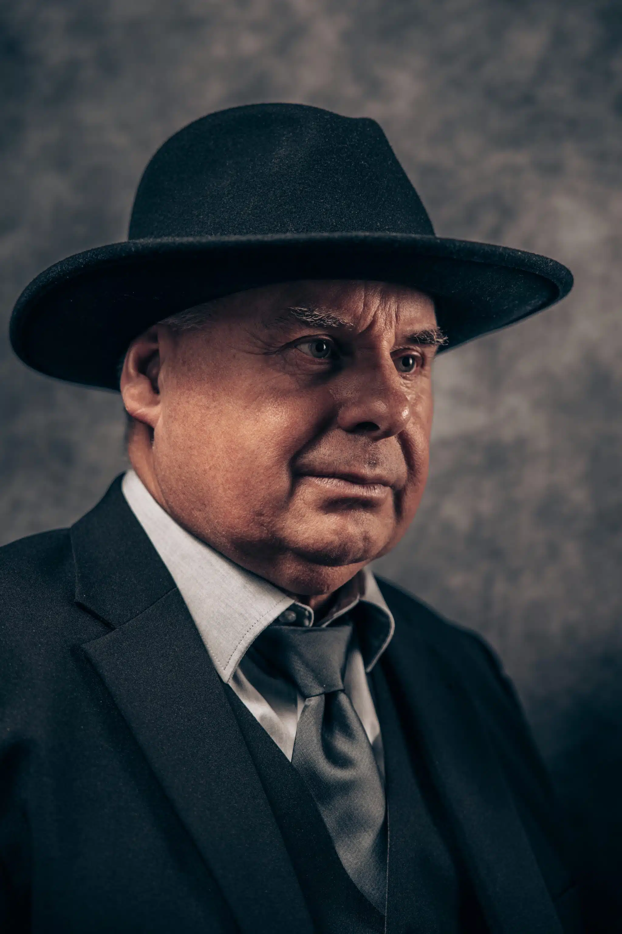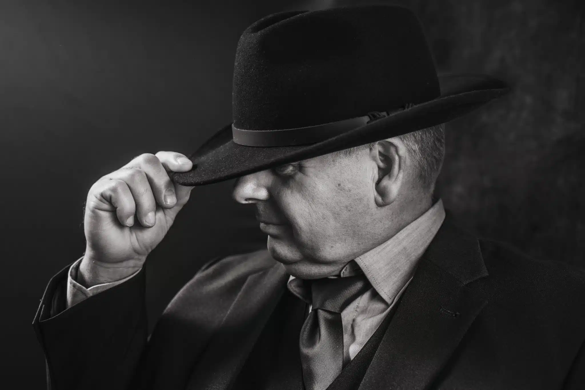 Das ist genau derselbe Mann! Aus dem alltäglichen Look haben wir ein kinoreifes Charakter-Porträt gezaubert. Mit Anzug, Hut, einem Glas Whiskey und diesem dramatischen, filmreifen Licht haben wir einen Vibe kreiert, der direkt aus einem 1920er-Jahre Film Noir stammen könnte. Knallhart, ausdrucksstark und mit einer unglaublichen Präsenz.