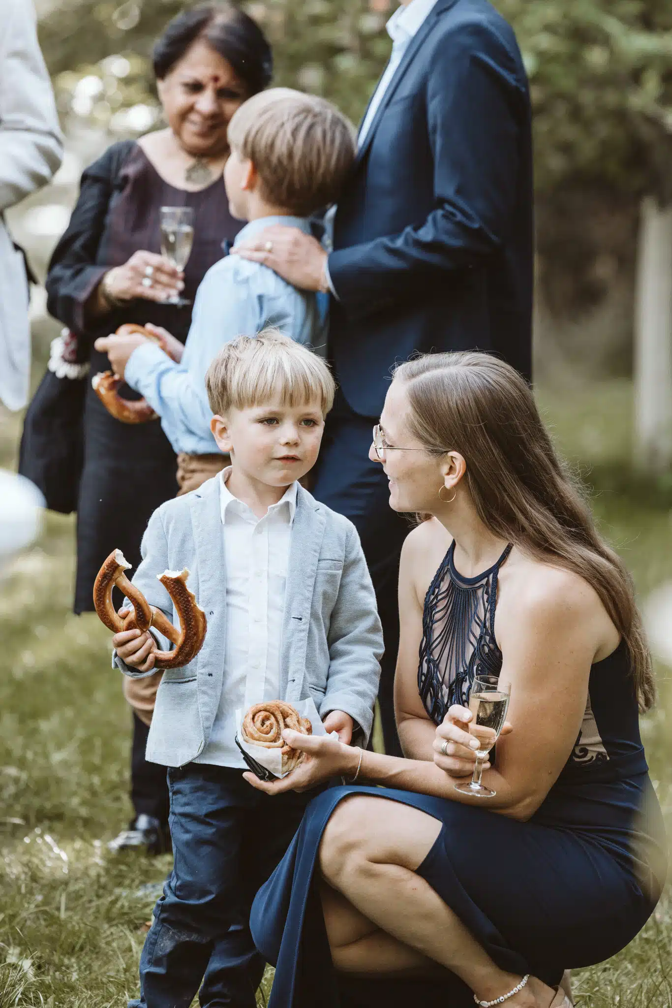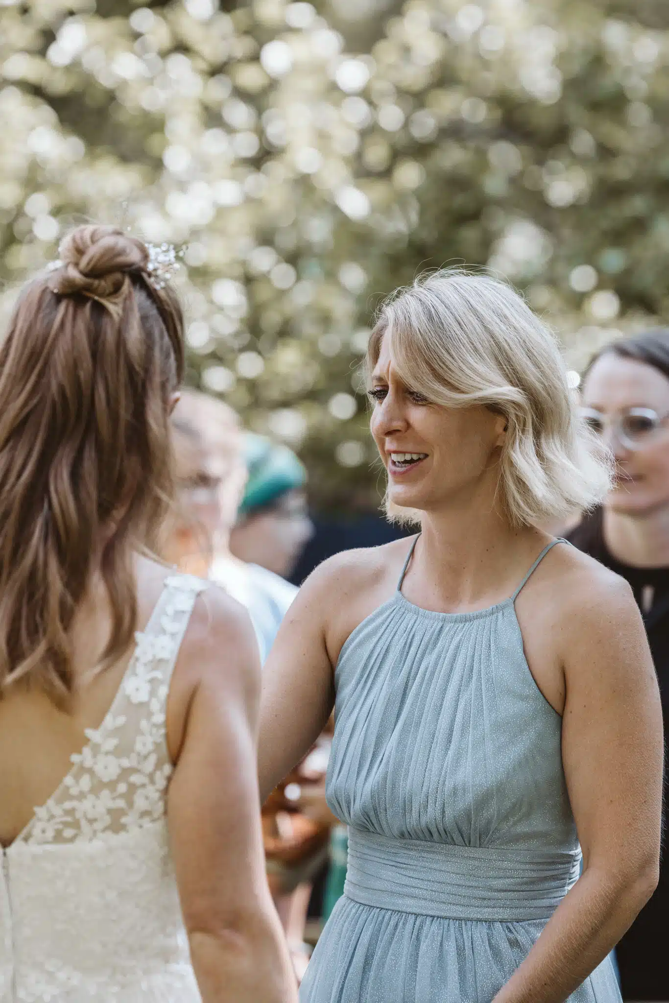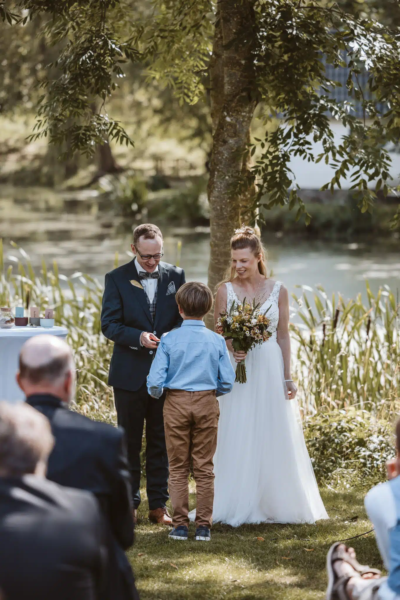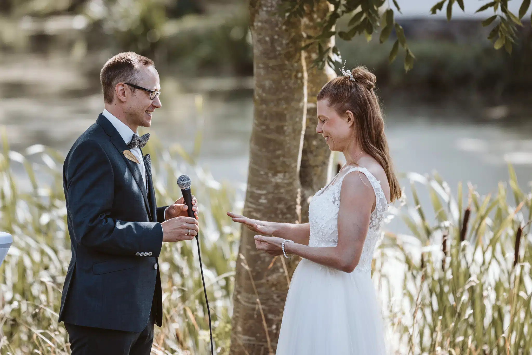 Die Zeremonie unter freiem Himmel war einer dieser Momente, die man als Hochzeitsfotograf liebt. Das weiche nordische Licht, der Wind, der leise durch die Bäume strich, und zwei Menschen, die sich inmitten ihrer Liebsten Versprechen gaben, die unter die Haut gingen. Mein Ziel dabei? Fast unsichtbar zu sein. Die Träne, die verstohlen weggewischt wurde, das laute Lachen bei den Anekdoten der Traurednerin – das sind die Augenblicke, die eine Reportage lebendig machen.