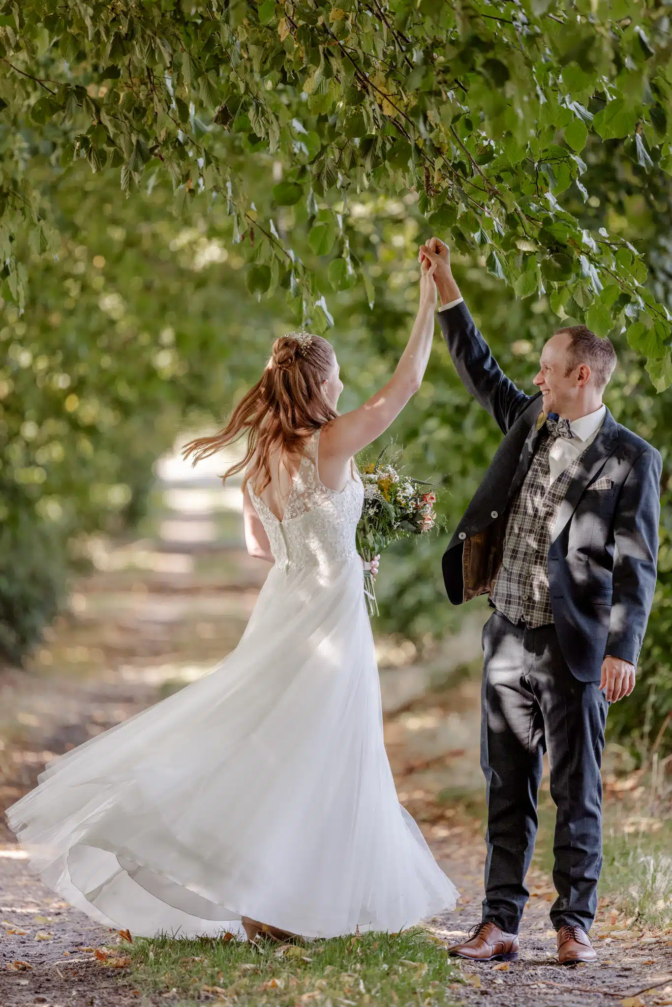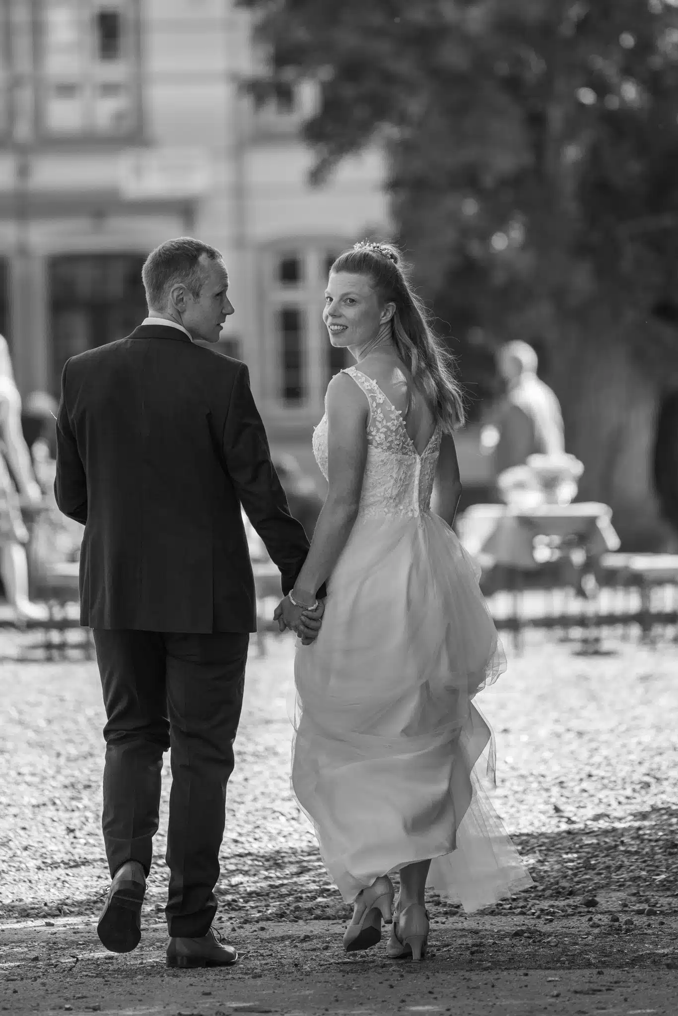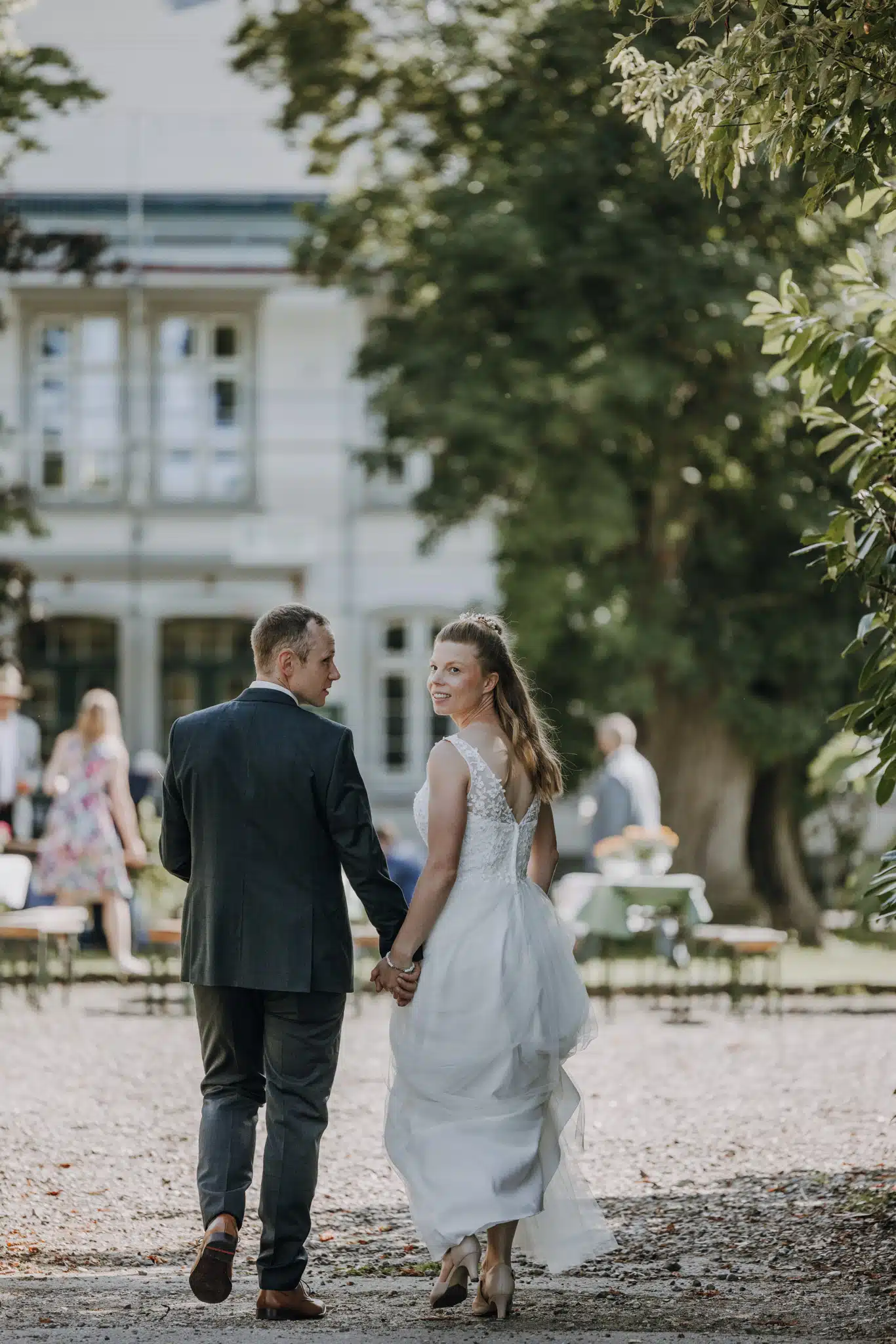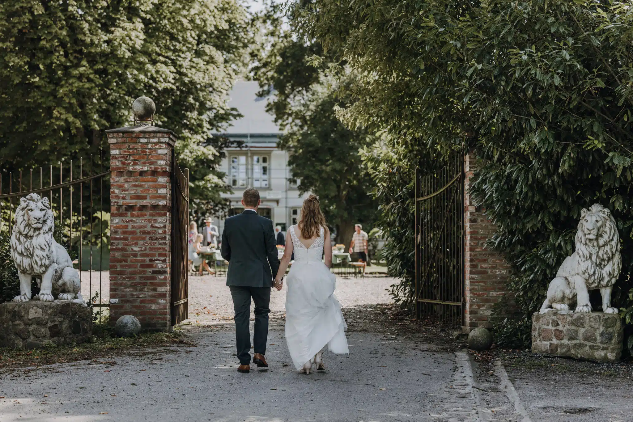 Nach der Trauung bot das weitläufige Gelände des Wittkielhofs unzählige Möglichkeiten für die Paarfotos. Wir haben uns für einen entspannten Spaziergang entschieden, weg vom Trubel der Gäste. Ohne steife Posen, einfach Wilma und Hannes, wie sie sind. Die Backsteinwände des Hofs, die alten Tore und die weiten Felder drumherum bildeten den perfekten Kontrast zur Eleganz der beiden.